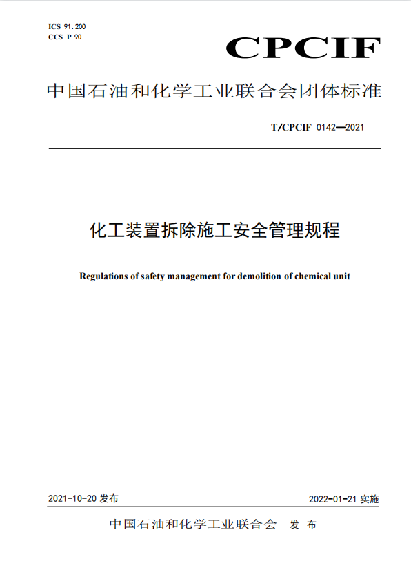 由中國化工施工企業(yè)協(xié)會(huì)主編、中石化工建設(shè)有限公司參與編制的《化工裝置拆除施工安全管理規(guī)程》(以下簡(jiǎn)稱“規(guī)程”),于2021年10月20日正式發(fā)布,并于2022年1月21日實(shí)施。