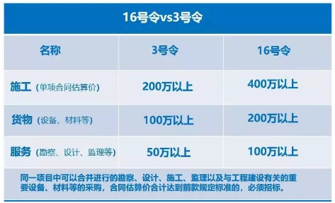 16號令刪除了原3號令中“省、自治區(qū)、直轄市人民政府根據(jù)實際情況,可以規(guī)定本地區(qū)必須進行招標(biāo)的具體范圍和規(guī)模標(biāo)準(zhǔn),但不得縮小本規(guī)定確定的必須進行招標(biāo)的范圍”的規(guī)定,明確全國適用統(tǒng)一規(guī)則,各地不得另行調(diào)整。